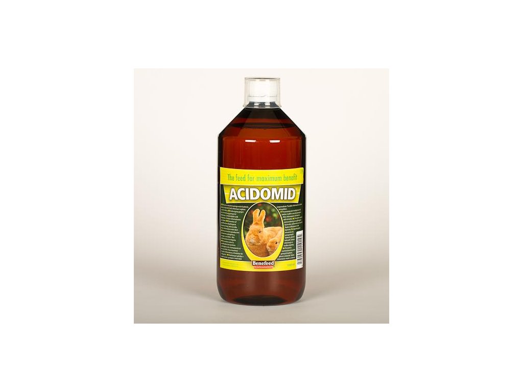 Acidomid je doplňkové krmivo určené k úpravě napájecí vody králíků. Obsahuje kombinaci organických kyselin, elektrolytů, minerálů a přírodních extraktů, které podporují trávení, zlepšují vstřebávání živin a přispívají k potlačení nežádoucích mikroorganismů v napáječkách. Pravidelné používání zajišťuje stabilní příjem vody a omezuje výskyt kokcidií, plísní a dalších patogenů. Acidomid neobsahuje léčiva, nemá ochrannou lhůtu a je vhodný pro každodenní použití. Lze jej kombinovat s jinými produkty řady BeneFeed. Podává se v dávce 10 ml na 1 l napájecí vody, první 2–3 dny je možné dávku zvýšit na 15 ml/l. Produkt je dobře snášen i mláďaty.