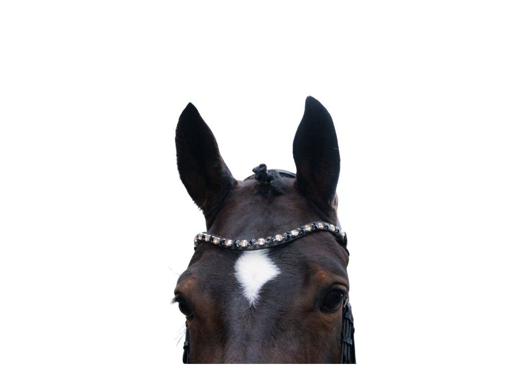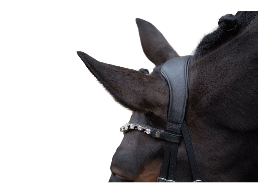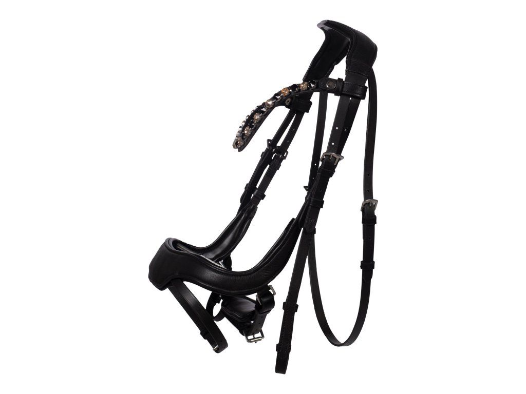 Uzdečka je vyrobena z kvalitní kůže a má měkkou podbradní podložku. Čelenka je vybavena kamínky, které lze snadno odepnout pomocí patentek. Součástí uzdečky jsou protiskluzové otěže.