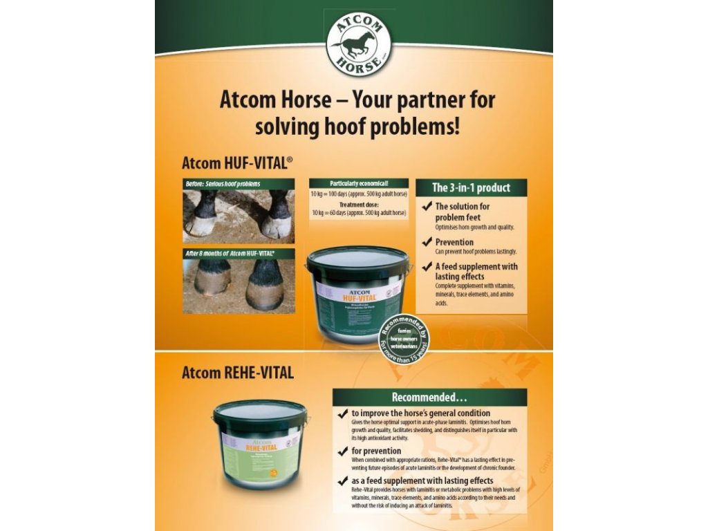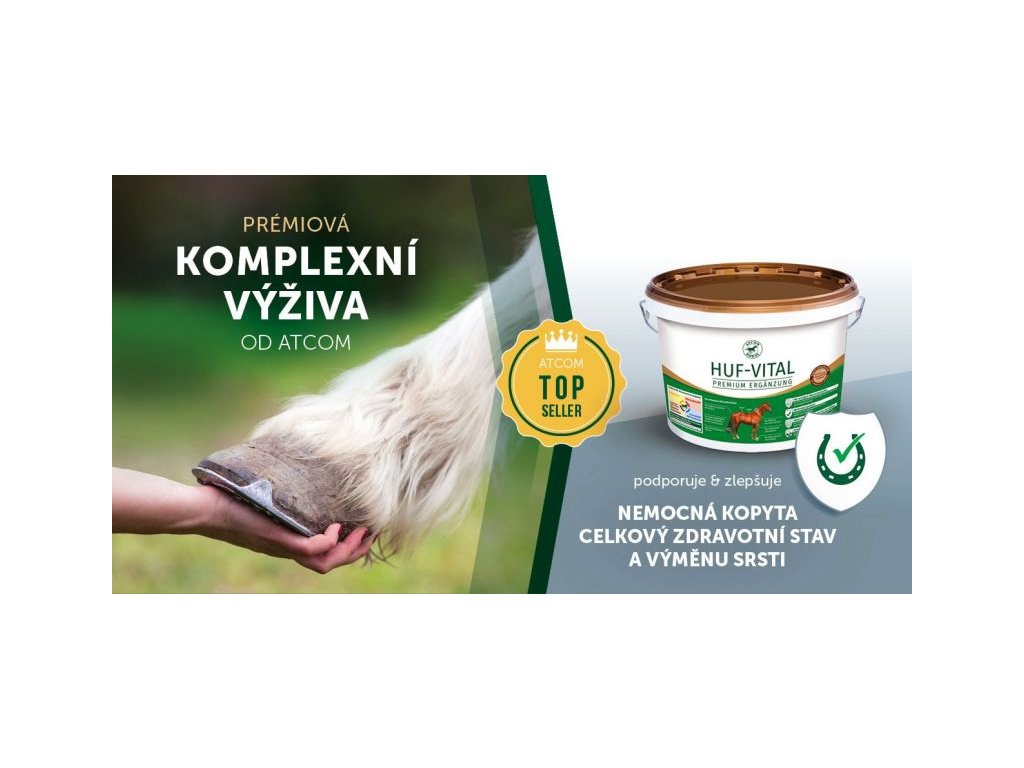 ATCOM HUF-VITAL® 5 kg je specializovaný výživový doplněk pro koně, jehož účinné složky podporují regeneraci a zdravý růst kopytní rohoviny. Obsahuje organicky vázané stopové prvky (zinek, měď, mangan), biotin, methionin, křemík a vitaminy důležité pro metabolismus kopytní tkáně. Díky svému vyváženému složení zlepšuje strukturu, pevnost a pružnost kopyt, pomáhá snižovat jejich lámavost a praskání. Vhodné zejména při špatné kvalitě kopyt, poškozené rohovině nebo jako prevence pro koně ve vyšší zátěži.