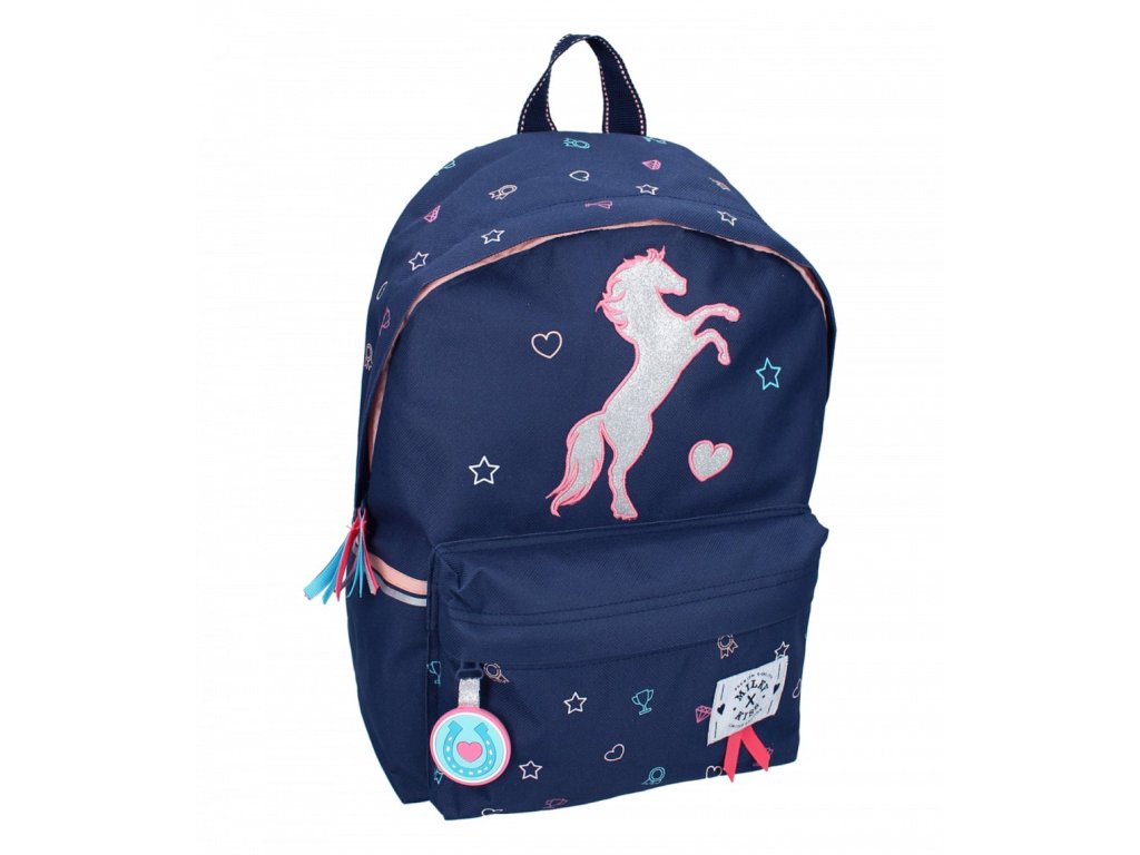 - Roztomilý jezdecký design: Batůžek zdobí krásný motiv koně (zřejmě pegas s třpytkami dle obrázku), doplněný o hvězdičky a srdíčka, což ho činí neodolatelným pro všechny malé jezdce a fanoušky koní.