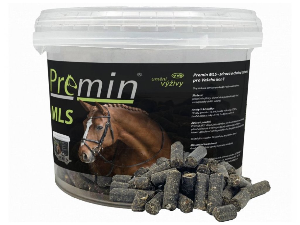 Premin MLS bezobilné pamlsky jsou chutnou a zdravou odměnou, která neobsahuje obiloviny ani nadbytečný cukr. Díky složení na bázi jablečných výlisků, slunečnicového šrotu a svatojánského chleba jsou lehce stravitelné a vhodné i pro koně s citlivějším zažíváním. Používají se jako doplněk běžného krmiva, přičemž doporučená denní dávka je přibližně 0,25 kg na koně. Výrobek není určen jako kompletní krmivo a měl by být podáván s mírou. Pamlsky jsou baleny v uzavíratelném kbelíku, který chrání obsah před vlhkostí a usnadňuje dávkování.