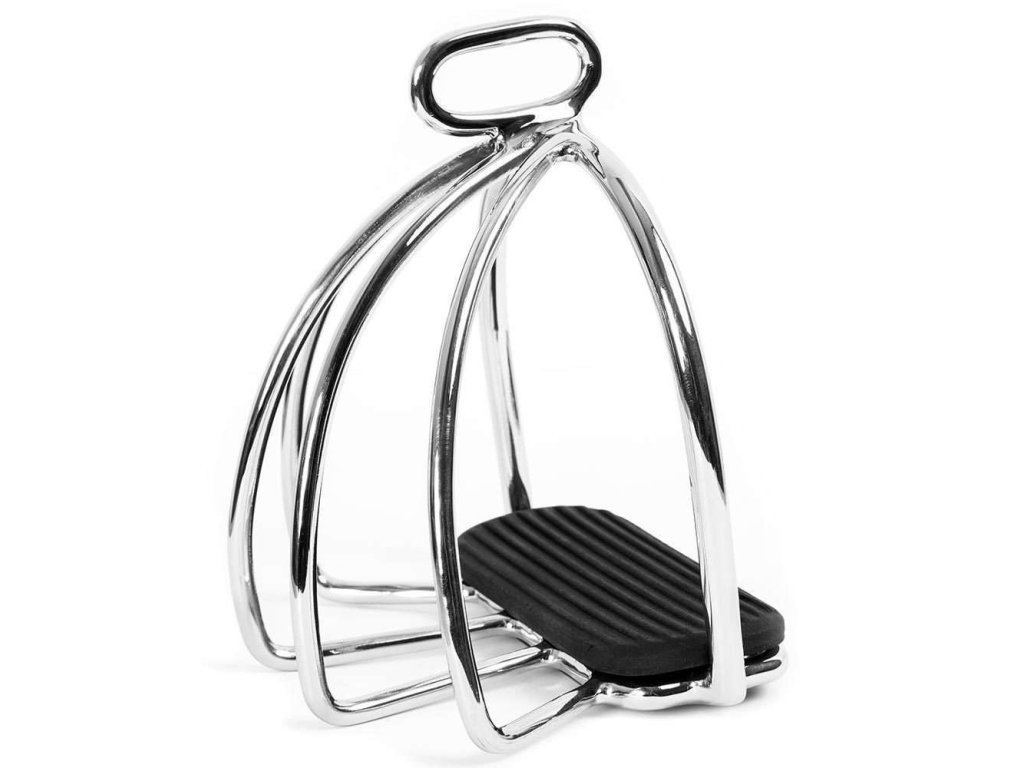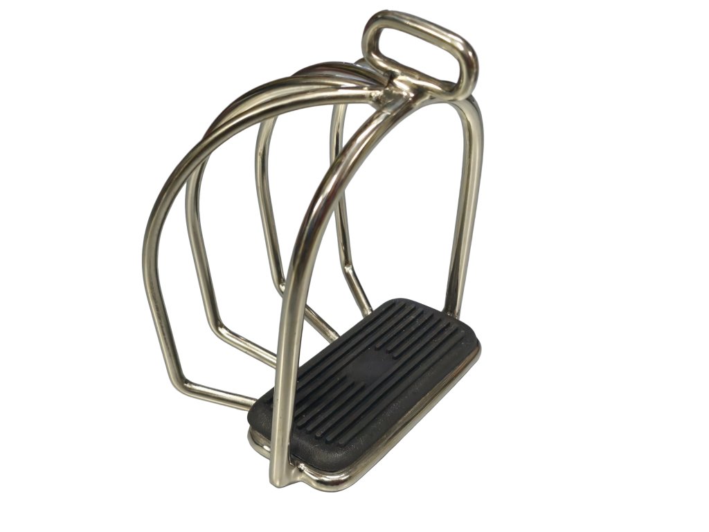 Tyto bezpečnostní třmeny jsou vyrobeny z odolné nerezové oceli a vybaveny plastovým košíčkem, který zabraňuje proklouznutí nohy a zvyšuje bezpečnost jezdce. Protiskluzová gumová nášlapná plocha zajišťuje stabilitu i za nepříznivých podmínek. Očko pro uchycení třmenového řemenu je natočeno tak, aby třmen zůstal ve správné poloze, což usnadňuje nasednutí a zvyšuje komfort během jízdy. Šířka třmenu 12 cm je vhodná pro většinu jezdců.