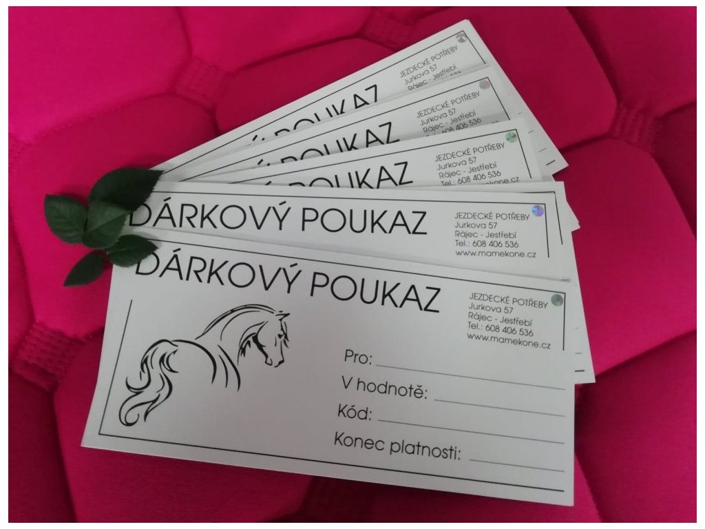 Dárkový poukaz lze využít na nákup na prodejně jezdeckých potřeb v Rájci-Jestřebí nebo při nákupu přes e-shop www.mamekone.cz