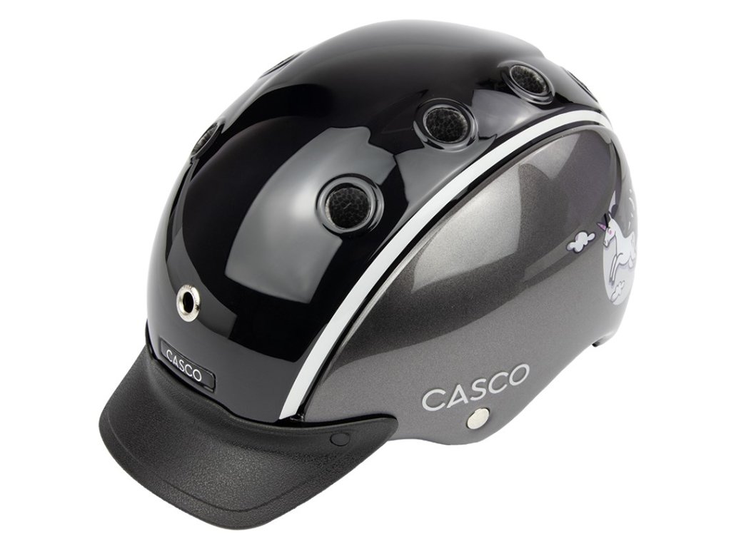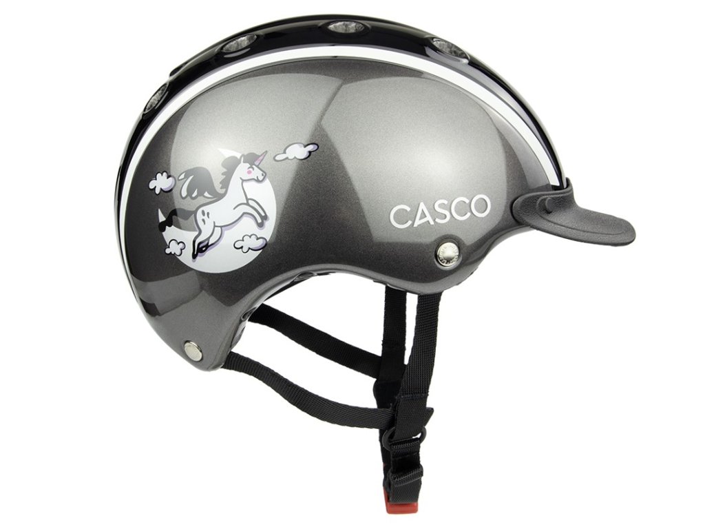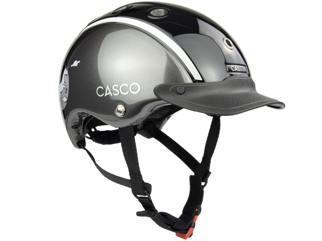 Dětská jezdecká helma Casco Nori Moonbeam v elegantní antracitové barvě s veselým motivem jednorožce kombinuje vysokou míru bezpečnosti s atraktivním designem. Díky velmi lehké konstrukci a nastavovacímu kolečku se snadno přizpůsobí i menší hlavě. Helma je vybavena velkými větracími otvory pro optimální cirkulaci vzduchu a měkkým polstrováním pro maximální pohodlí. Prodloužená část v oblasti spánků a týlu chrání hlavu dítěte před nárazy. Vybavena je čtyřbodovým zapínáním s měkce polstrovanou přezkou. Vhodná nejen pro jízdu na koni, ale i pro cyklistiku a lyžování. Certifikována dle normy EN 1384:2023.