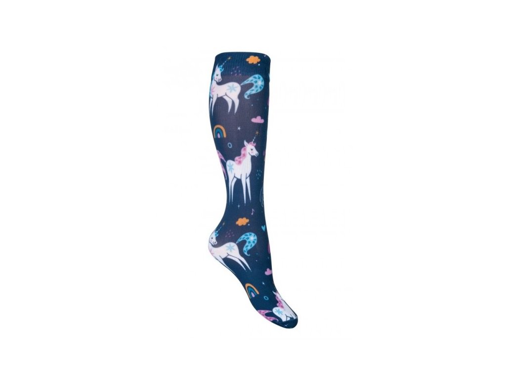 Podkolenky se pyšní barevnými celoplošnými potisky, které zahrnují motivy jednorožců, duhy a dalších kouzelných prvků, což z nich dělá zábavný a atraktivní kousek. Jejich střih je obzvláště pohodlný díky obsahu elastanu, který zajišťuje perfektní padnutí a příjemný pocit na noze po celou dobu jízdy.