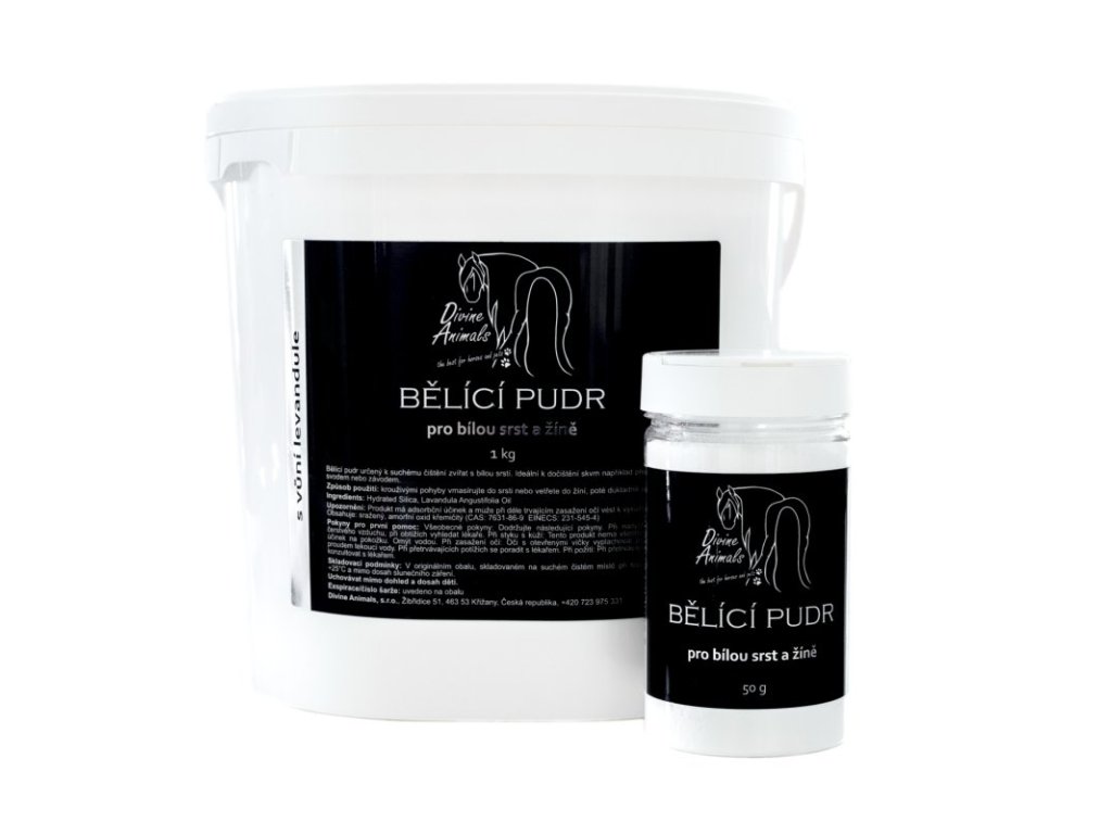 Bělící pudr Divine Animals je speciálně vyvinut pro péči o bílou a světlou srst koní. Pomáhá odstranit zažloutlé skvrny, nečistoty a zvýraznit přirozenou barvu srsti. Díky jemnému složení je šetrný k pokožce, nedráždí a je vhodný i pro citlivé jedince. Snadná aplikace ve formě pudru umožňuje rychlé použití před závody nebo výstavami, bez nutnosti oplachování. Působí okamžitě a dodává srsti zdravý, zářivý vzhled.