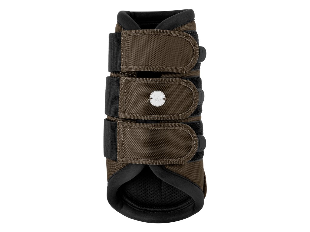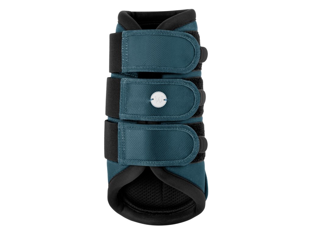 Drezurní chrániče Comfort Fit od značky Waldhausen jsou navrženy pro přední i zadní nohy a kombinují vysoký stupeň ochrany s pohodlným nošením. Vnitřní materiál z prodyšné síťoviny zabraňuje přehřátí a podporuje optimální ventilaci. Vnější materiál z pevné tkaniny 1680 denier odolává nárazům i oděru a chrání končetiny koně při práci. Široké suché zipy s elastickými částmi zajišťují individuální přizpůsobení a stabilitu. Menší velikosti mají dvě zapínání, větší tři. Design doplňuje kovové logo, které výrobku dodává elegantní vzhled.