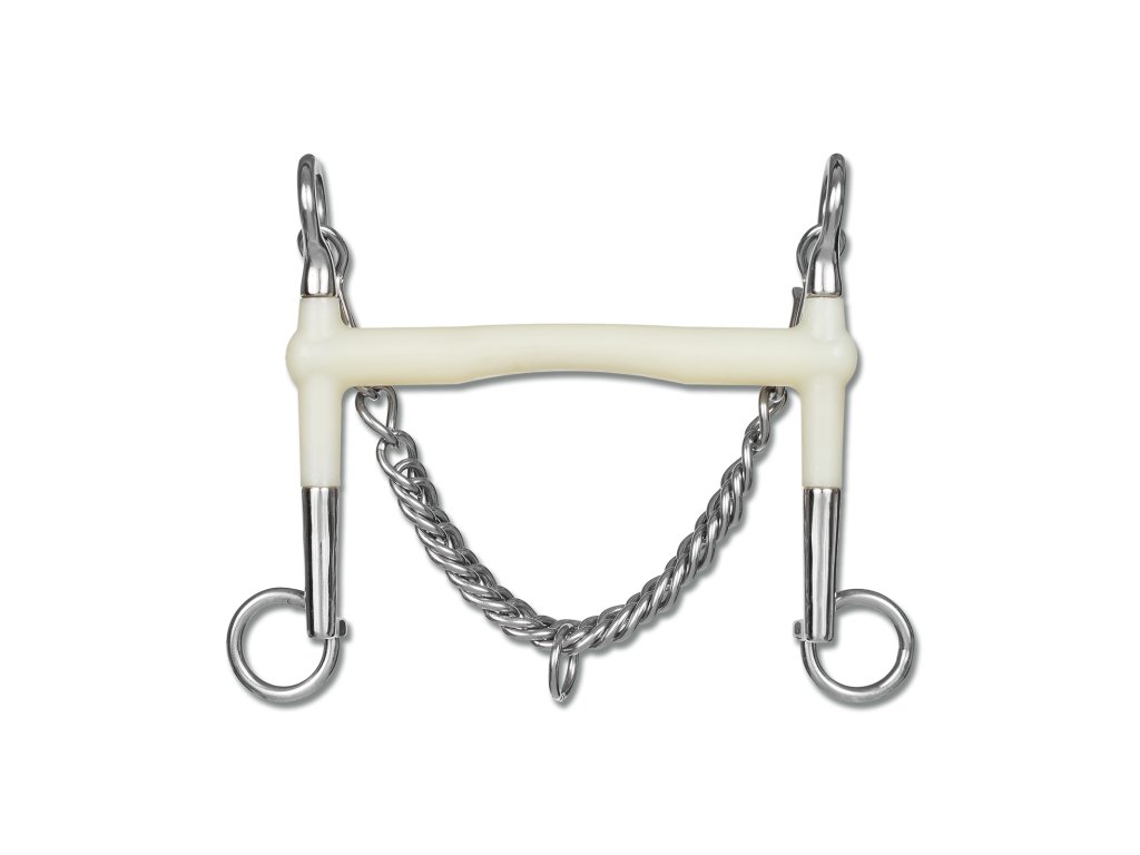 Tato drezurní páka značky HAPPY MOUTH je ideální volbou pro citlivé koně, kteří hůře přijímají kovová udidla. Hladký plastový náustek s dlouhotrvající jablečnou příchutí stimuluje žvýkací aktivitu a podporuje ochotu koně přijmout udidlo. Díky rovné konstrukci působí rovnoměrně na jazyk. Páka je vybavena pevnými rameny a podbradním řetízkem pro stabilní polohu v hubě. Spojovací části a kroužky jsou z odolné nerezové oceli. Horní rameno měří 5 cm, dolní 7 cm.