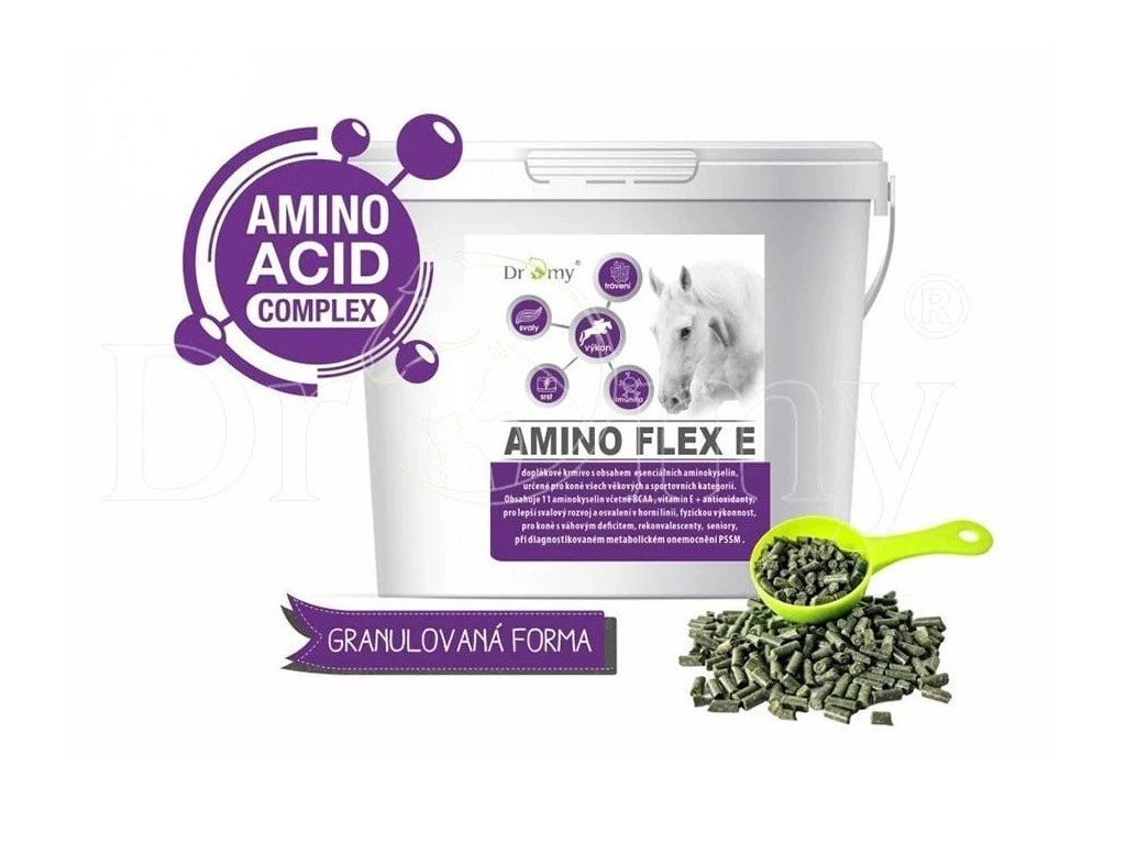 Amino Flex E je granulované doplňkové krmivo s obsahem esenciálních aminokyselin v koncentrované formě, určené pro všechny kategorie koní. Granulovaná forma je koňmi velmi dobře přijímaná, je neprašná a koně ji z krmiva nevytřídí jako práškové doplňky.