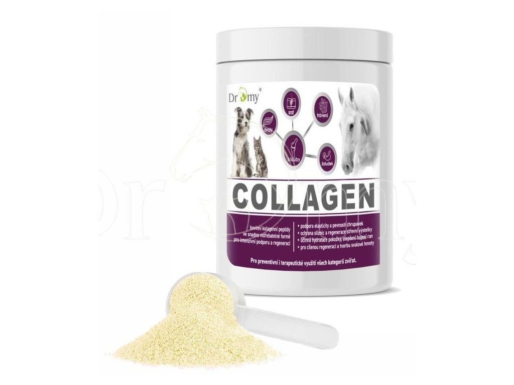 DROMY Collagen je prémiový doplněk výživy pro koně, který obsahuje hydrolyzované kolagenní peptidy z hovězího kolagenu (typ I a III) s nízkou molekulovou hmotností (~3 kDa). Díky tomu jsou snadno vstřebatelné a účinné při: