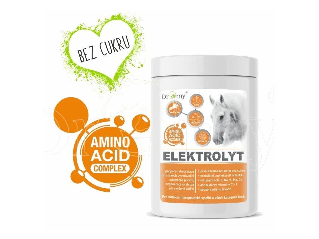 Dromy Elektro-Aminolyt je pečlivě formulovaný doplněk, navržený pro podporu rychlé rehydratace. Obsahuje všechny ionizované formy minerálních solí, chlorid, sodík, draslík, hořčík, vápník, ve formě aniontů a kationtů, jako tělesné tekutiny vašeho koně.Podáváme za účelem vytvoření izotonického roztoku, do vody / krmné dávky, pro doplnění potřebných elektrolytů, které jsou nezbytné pro účinnou a rychlou rehydrataci, podporu příjmu tekutin, vyrovnání ztát elektrolytů vyloučených potem. Důležité elektrolyty na aminokyselinovém základě.Koncentrovaná dávka minerálních solí, esenciálních aminokyselin, vitaminů pomáhají organismu normalizovat metabolismus na optimální fyziologickou hranici. Aminolyty jsou směsí aminokyselin a elektrolytů, které se vyplavují během intenzivní svalové zátěže. Jsou nezbytné pro udržení správné hladiny vody v organismu a odpovědné za svalovou regeneraci. Elektro-Aminolyt je vynikajícím energetickým doplňkem, který obnovuje anabolické procesy a inhibuje katabolické procesy. Pomáhá snižovat nástup metabolické acidózy a zatuhlost svalů způsobené pyruvátem a kyselinou mléčnou. Je nezbytný pro zachování integrity svalstva během období vysoké zátěže a náročného výkonu. Pomáhá zmírnit vyčerpání a urychluje a zkracuje potřebnou dobu regenerace organismu po fyzické zátěži. Esenciální aminokyseliny BCAA s rozvětveným řetězcem: L-leucin, L-isoleucin a L-valin jsou významné pro svalový metabolismus.Snížená hladina elektrolytů a aminokyselin vede u koní ke snížení výkonnosti v důsledku dehydratace, svalovým problémům jako např. myopatie a k tvorbě kyseliny mléčné ve svalech. Antioxidanty, vitaminy C&E pomáhají chránit svalová vlákna ničením "volných radikálů", škodlivého vedlejšího produktu, vznikajícího při práci svalů.Ztráty elektrolytů se výrazně zvětšují v teplém počasí a při zvýšené zátěži, tehdy je třeba přikládat ještě větší důležitost pravidelnému podávání elektrolytu.
