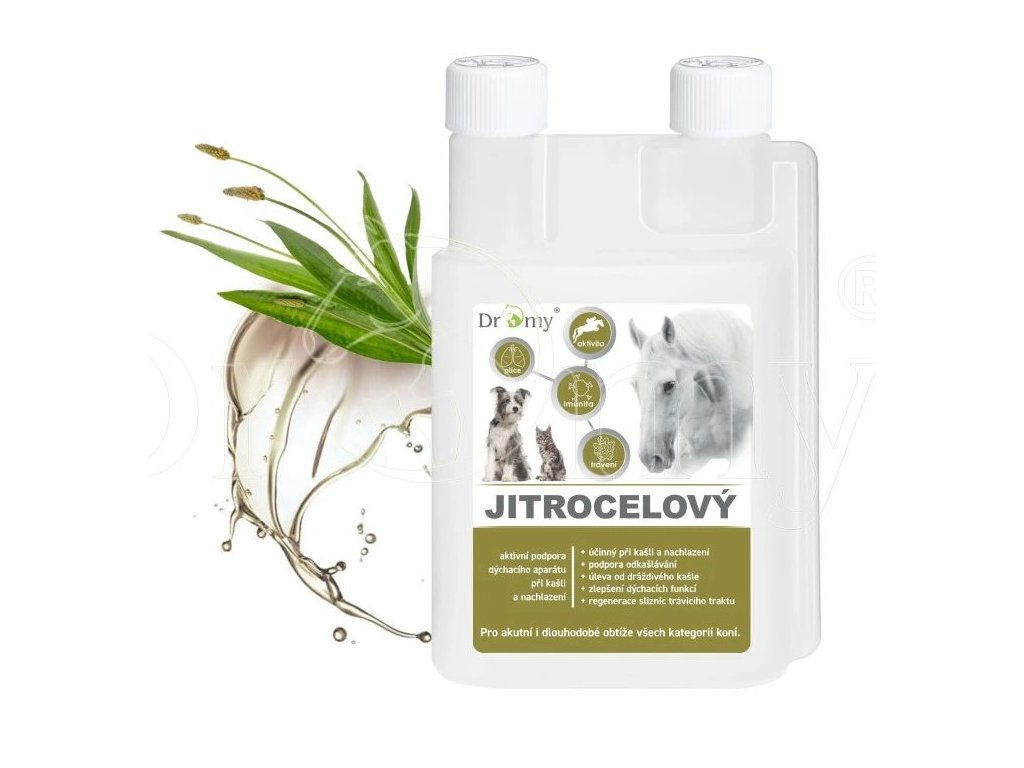 DROMY Jitrocelový sirup je tekutý doplněk krmiva pro koně, založený na extraktu z jitrocele (Plantago major), známého svými zklidňujícími a expektoračními vlastnostmi. Tento sirup pomáhá: