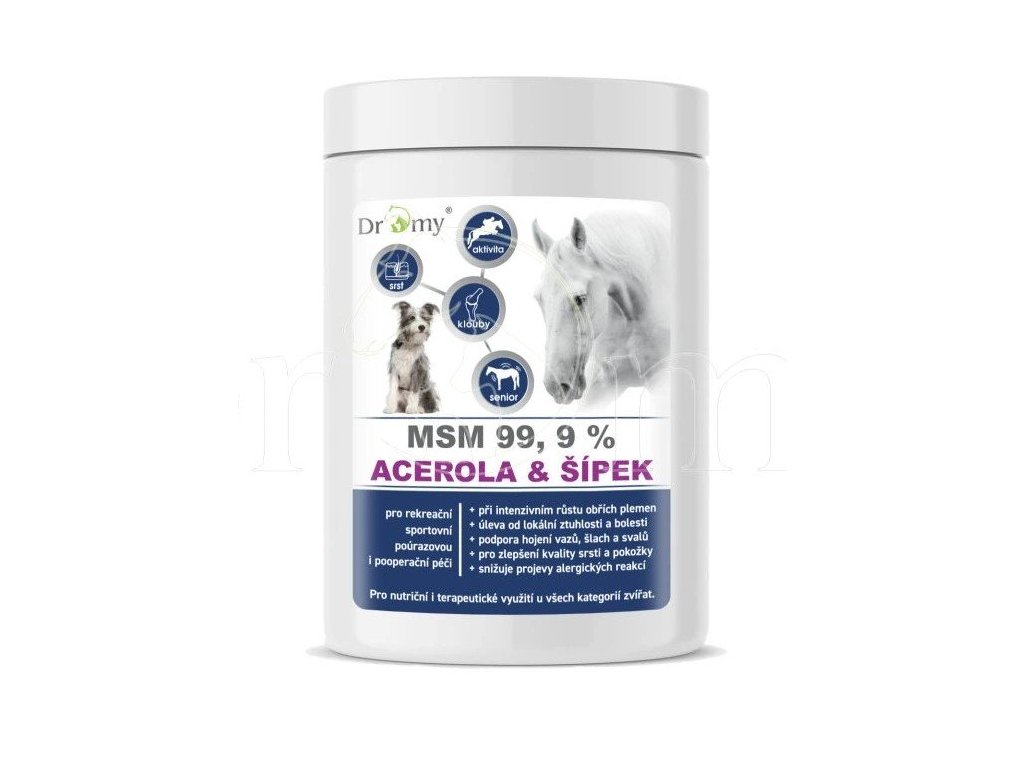 Dromy MSM 99,9 % + acerola + šípek je vysoce účinný přírodní doplněk pro koně, zaměřený na podporu pohybového aparátu a imunitního systému. Obsahuje methylsulfonylmethan (MSM) farmaceutické kvality, který působí protizánětlivě a napomáhá regeneraci kloubních tkání.
