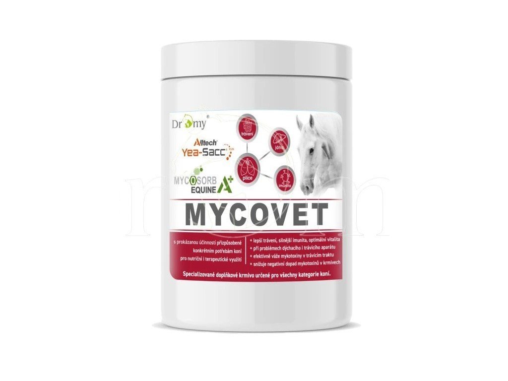Myco-Vet je doplňkové krmivo určené k eliminaci mykotoxinů, jedů produkovaných plísněmi, vyskytující se v krmivech.Obsahuje nejnovější generaci vyvazovače mykotoxinů Alltech Mycosorb A+,který z organismu nevyvazuje vitaminy ani minerální látky.Při průchodu trávicím traktem na sebe navazuje pouze polární tak i nepolární mykotoxinya tím zabraňuje jejich absorpci z trávicího traktu do cévního řečiště. Navázané mykotoxiny jsou vyloučeny trusem.Probiotické mikroorganismy s živou, kvasinkovou kulturu Alltech - YEA SACC ®1026,podporují obnovu přirozené rovnováhy střevní mikroflóry.Využívají škodlivé látky způsobující nadměrné překyselení trávicího traktu a tím vytváří ideální prostředípro růst a rozmnožování potřebných buněčných mikroorganizmů,které zajišťují trávení a vstřebávání živin z krmné dávky.