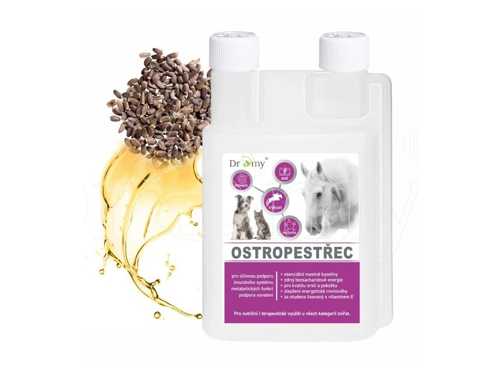 Dromy Ostropestřcový olej je přírodní doplněk výživy pro koně získávaný šetrným lisováním za studena z plodů ostropestřce mariánského (Silybum marianum). Tento olej je bohatý na nenasycené mastné kyseliny, zejména kyselinu linolovou (omega-6), a přirozeně obsahuje účinnou látku silymarin, která má blahodárný vliv na funkci jater a žlučníku.