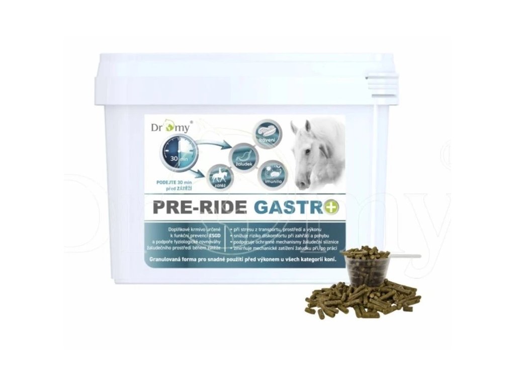 Pre-Ride Gastro je doplňkové krmivo určené k podání před zátěží, které respektuje fyziologii žaludku koně. Jeho přínosem je zlepšení žaludečního komfortu při/po zátěži, omezení negativního působení kyselého obsahu na sliznici během pohybu a zvýšení tolerance zátěže, zejména u citlivých koní.