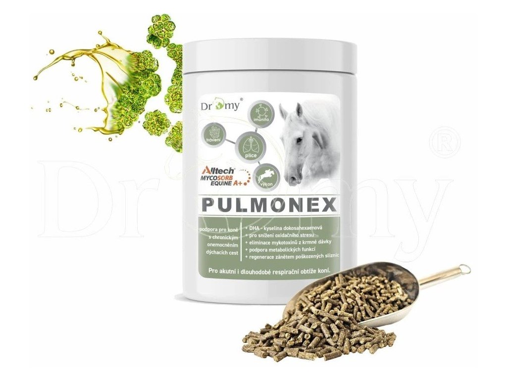 Pulmonex je doplňkové krmivo pro podporu a regeneraci dýchacích funkcí koní,trpících chronickým onemocněním dýchacích cest.U chronického postižení dýchacího aparátu se převážně jedná o alergickou odpověď imunitního systému,který přichází do kontaktu s organickými alergeny, jako jsou spory plísní, prvocia mechanické částice prachu ze sena, slámy a prostředí stáje.Projevuje se častým zhoršeným dýcháním, suchým a neproduktivním kašlem, který v počátku neprovází výtok z nozder.Příčina alergické reakce je dána i aktuálním stavem imunitního systému koně. Pulmonex je doplňkovým krmivem pro podporu a regeneraci dýchacích funkcí.Obsahuje bylinné extrakty, vitaminy a stopové prvky, které se významně podílí na stimulaci imunitního systému,na ředění hlenu v dýchacích cestách. DHA = kyselina dokosahexaenová, u které byl opakovaně prokázán pozitivní vliv dlouhodobého podávání na snížení projevů:koňského astmatu (RAO, rekurentní obstrukce dýchacích cest;IAD, zánětlivé onemocnění dýchacích cest). Alltech Mycosorb A+ k eliminaci mykotoxinů, jedů produkovaných plísněmi,vyskytující se v krmivech.Při průchodu trávicím traktem na sebe navazuje polární tak i nepolární mykotoxinya tím zabraňuje jejich absorpci z trávicího traktu do cévního řečiště. Pukléřka islandská obsahuje polysacharidy a slizovité látky,které chrání zánětem poškozené sliznice.Vitamin C a extrakty zázvoru a zeleného čaje, MSM: antioxidanty a bioflavonoidypodílející se na snížení oxidačního stresu.Eukalyptus globulus bylina podílející se na ředění hlenů v dýchacích cestách a napomáhá vykašlávání. Zázvor lékařský extrakt působí spasmolyticky a protizánětlivě, příznivě ovlivňuje periferní prokrvení.Adhatoda vasica extrakt se podílí na snížení viskozity bronchiálního sekretu a usnadňuje vykašlávání.Ostropestřec Mariánský - Silybum Marianum obsahuje flavonolignany,látky podporující regeneraci poškozených jaterních buněk.Česnek příznivě ovlivňuje střevní mikroflóru, působí detoxikačně, spasmolyticky,působí podpůrně proti infekčním onemocněním.Mateřídouška obecná extrakt vykazuje baktericidní, dezinfekční, expektorační,spazmolytické a protizánětlivé účinky. Upozornění: doplňkové krmivo používejte po odeznění akutních příznaků a projevů dušnosti.Při podávání jakéhokoli krmného doplňku, který má ovlivňovat dýchací funkce,je třeba brát v potaz způsob ustájení, kvalitu krmení a pravidelnou formu tréninku.