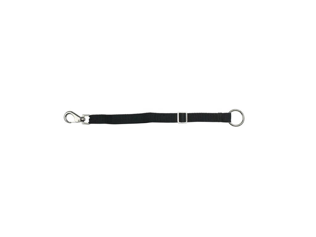 Popruh je nastavitelný, takže jej lze přizpůsobit různým průměrům a výškám uchycení. Kovové kování včetně karabiny zajišťuje pevné a bezpečné upevnění. Díky jednoduchému použití je ideální jak do stáje, tak na závody nebo přepravu.