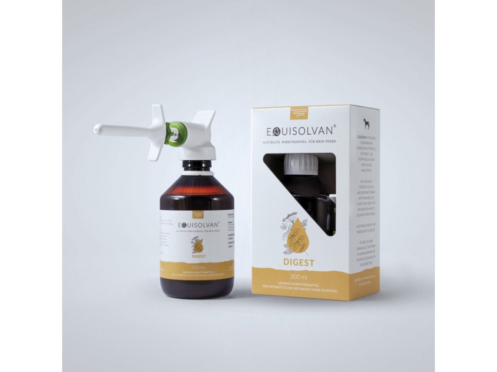 EQUISOLVAN Digest je přírodní tekutý doplněk krmiva pro koně, speciálně vyvinutý k podpoře zdravého trávení a rovnováhy střevní mikroflóry. Obsahuje kombinaci bylinných extraktů a esenciálních olejů (např. máta, fenykl, anýz), které napomáhají zklidnění trávicího traktu, zmírňují nadýmání a podporují činnost žaludku a střev.