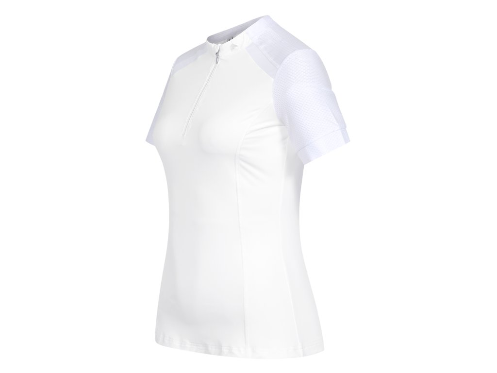 Závodní tričko Nancy s krátkým rukávem a zapínáním na zip přináší moderní vzhled a maximální pohodlí pro jezdkyně při závodech i běžném ježdění. Funkční materiál zajišťuje výbornou prodyšnost, odvádění vlhkosti a rychlé schnutí, což oceníte zejména v letních měsících. Elegantní střih lichotí postavě, zatímco decentní detaily jako stojáček a hladké zakončení rukávů dodávají tričku reprezentativní vzhled. Ideální pod sako na závody nebo jako samostatný kousek na trénink.