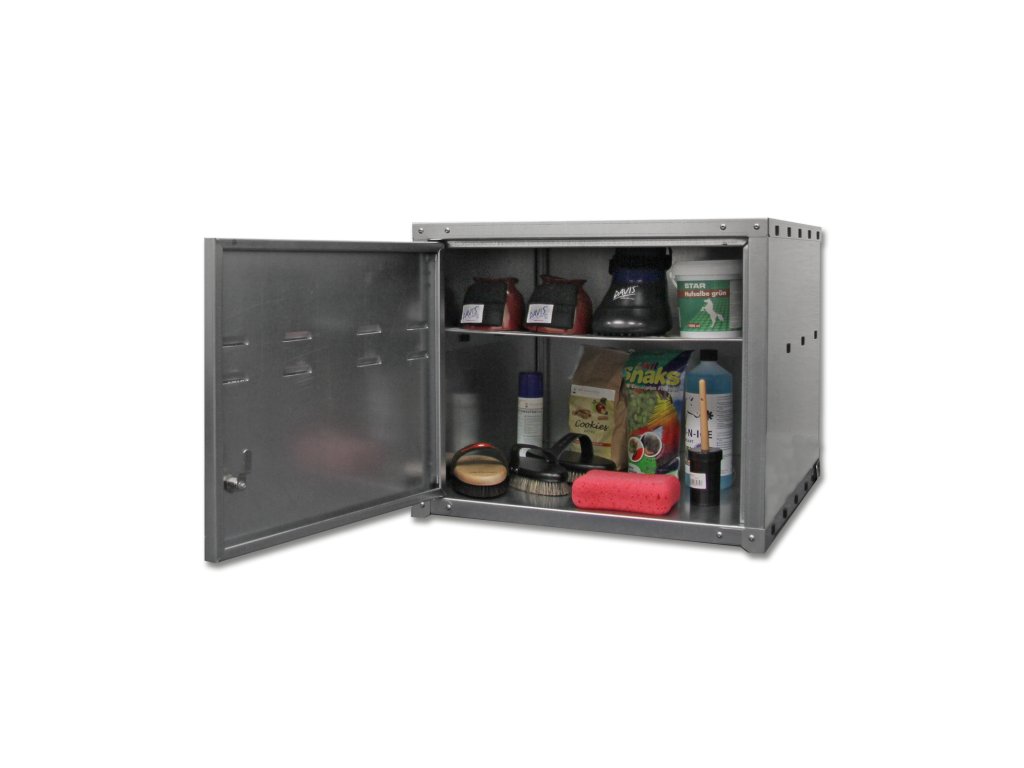 Horní skříň je vhodná jako nadstavba pro malou i velkou sedlovou skříň. Je vyrobena z odolného pozinkovaného ocelového plechu a umožňuje bezpečné uložení menších jezdeckých potřeb, jako jsou čištění, spreje apod. Díky čtyřbodové konstrukci je stabilní a snadná na montáž. Skříň je dodávána v rozloženém stavu bez dekorací, s návodem k sestavení. Pozor při manipulaci na možné ostré hrany.
