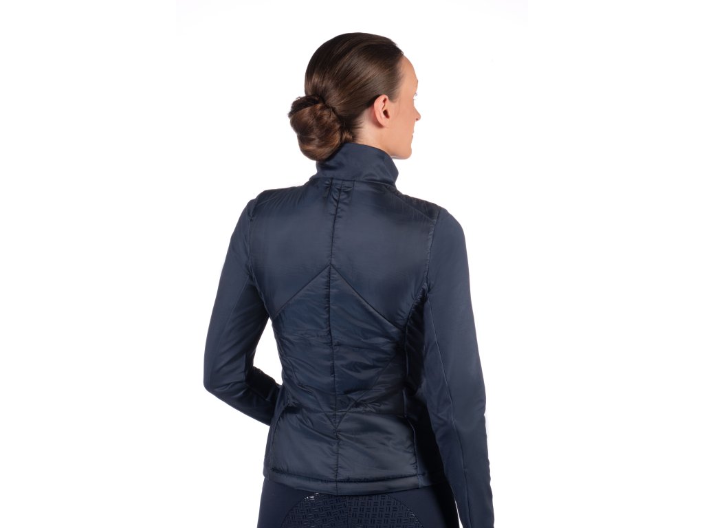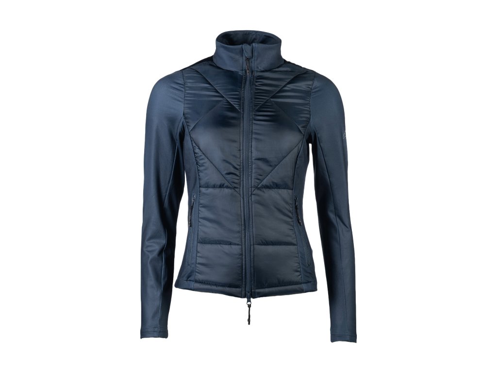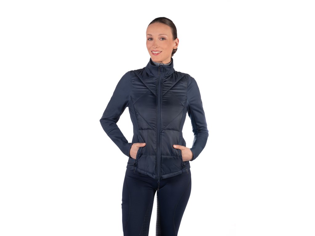 Bunda Prag II – Style HKM v tmavě modré barvě spojuje sportovní styl s funkčností. Díky pružným bočním dílům se dokonale přizpůsobí pohybu při ježdění a poskytuje maximální komfort. Je lehce zateplená měkkou výplní, což ji činí vhodnou pro chladnější dny. Vypasovaný střih podtrhuje dámskou postavu a moderní prošívání dodává elegantní vzhled. Praktické prvky zahrnují obousměrný zip, dvě kapsy na zip a stojáček, který chrání proti větru.