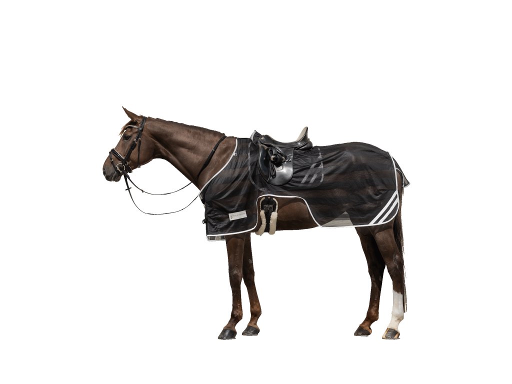 Lehký jezdecká deka proti mouchám z reflexní tkaniny a celoplošným reflexním lemováním. S výřezem na sedlo a ocasní šňůrou. 100% polyesterový materiál.