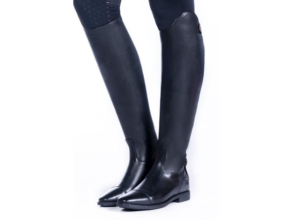 Boty jsou vybaveny elastickou vsadkou, která umožňuje lepší přizpůsobení lýtku. Zapínání na patentky usnadňuje manipulaci a pevná konstrukce zajišťuje stabilitu. Praktická opěrka na ostruhy ve třech polohách zvyšuje funkčnost při ježdění. Díky standardní výšce a šířce jsou vhodné pro široké spektrum jezdců.