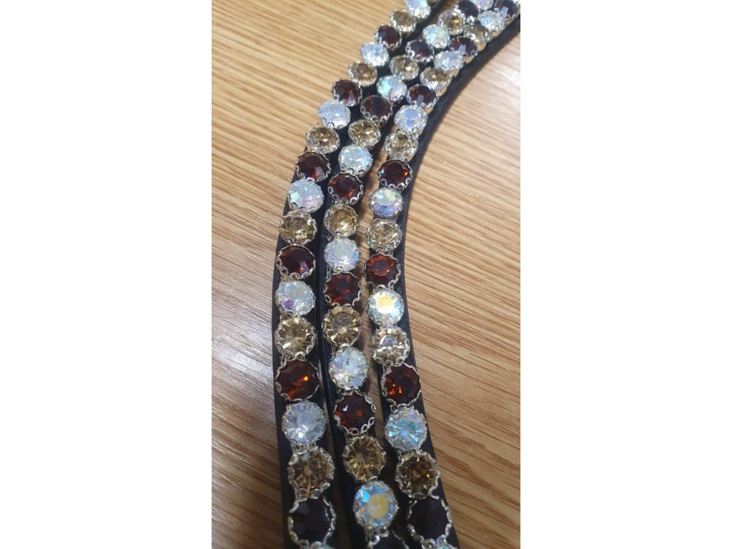 Čelenka HKM Crystals je vyrobena z kvalitní kůže a zdobena jednou řadou větších krystalů v jantarové a bílé barvě . Je navržena ve tvaru písmene "U" a vybavena zapínáním na patentky, což umožňuje rychlou a snadnou výměnu bez nutnosti rozebírat celou uzdečku . Tento elegantní doplněk dodá vaší uzdečce jedinečný vzhled a podtrhne styl vašeho koně.