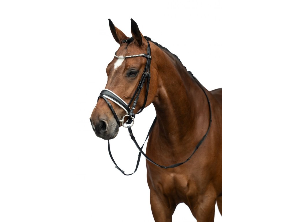 Uzdečka HKM Flora kombinuje funkčnost a stylový design, ideální pro náročné jezdce. Vyrobena z kvalitní kůže, nabízí pohodlí a odolnost. Měkce polstrovaný švédský nánosník a nátylník zajišťují komfort pro koně. Čelenka zdobená lesklými kamínky dodává uzdě elegantní vzhled. Součástí jsou plátěné otěže s koženými zarážkami.