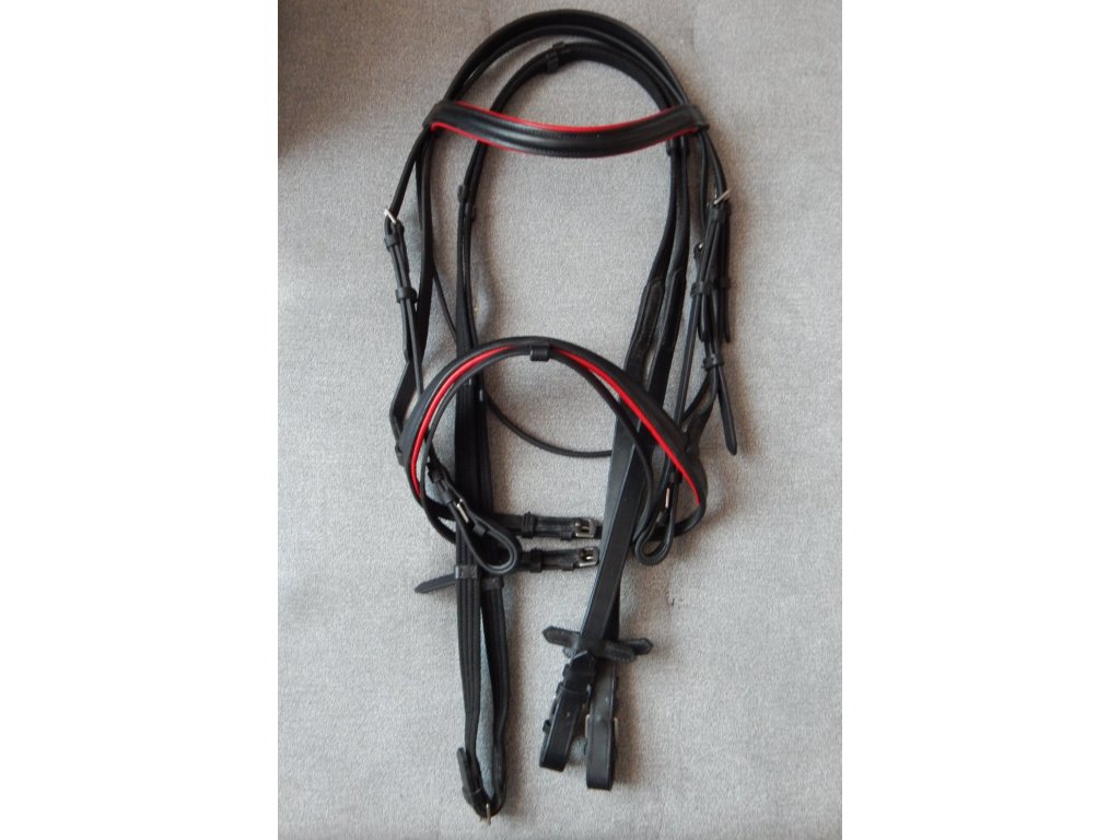 Kožená uzdečka Mámekoně černá s červeným podložením s otěžemi