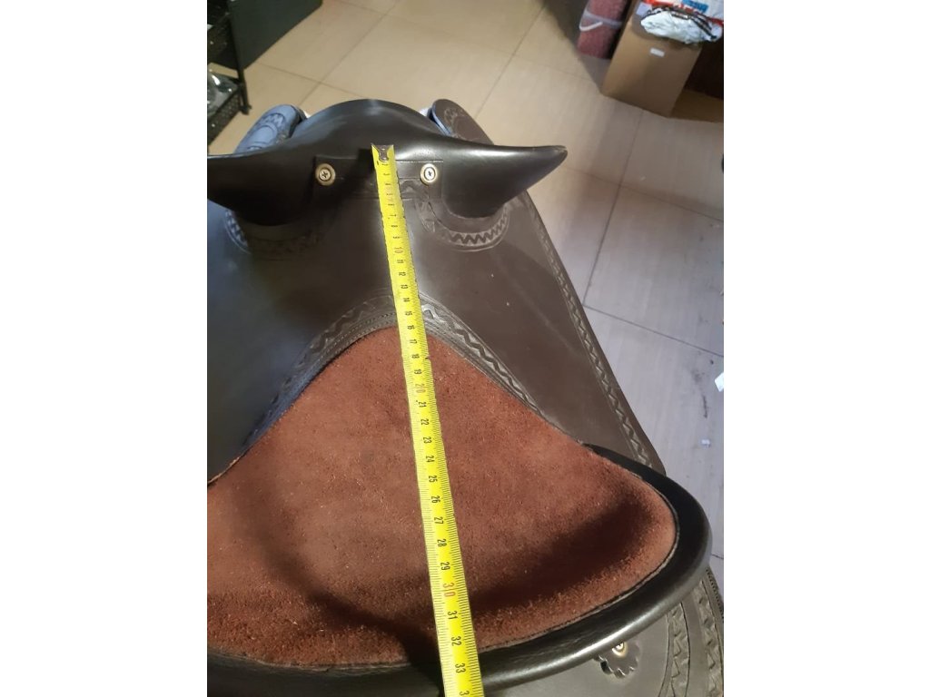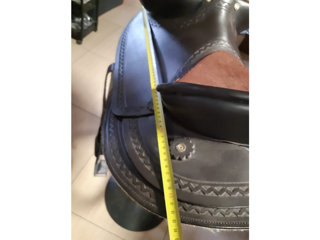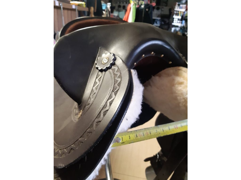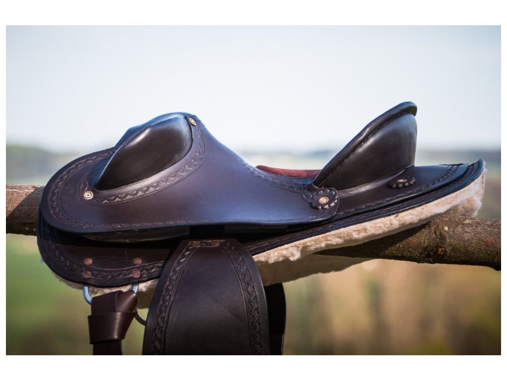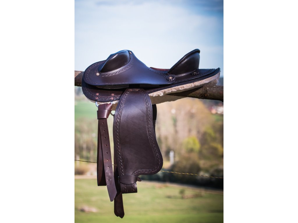 Toto kožené westernové sedlo bez hrušky je ideální pro jezdce hledající jednoduchý a pohodlný posed. Absence hrušky poskytuje volnost pohybu a umožňuje lepší kontakt s koněm. Sedlo je vyrobeno z kvalitní kůže, která zajišťuje dlouhou životnost a estetický vzhled. Díky svému designu je vhodné pro různé jezdecké aktivity.