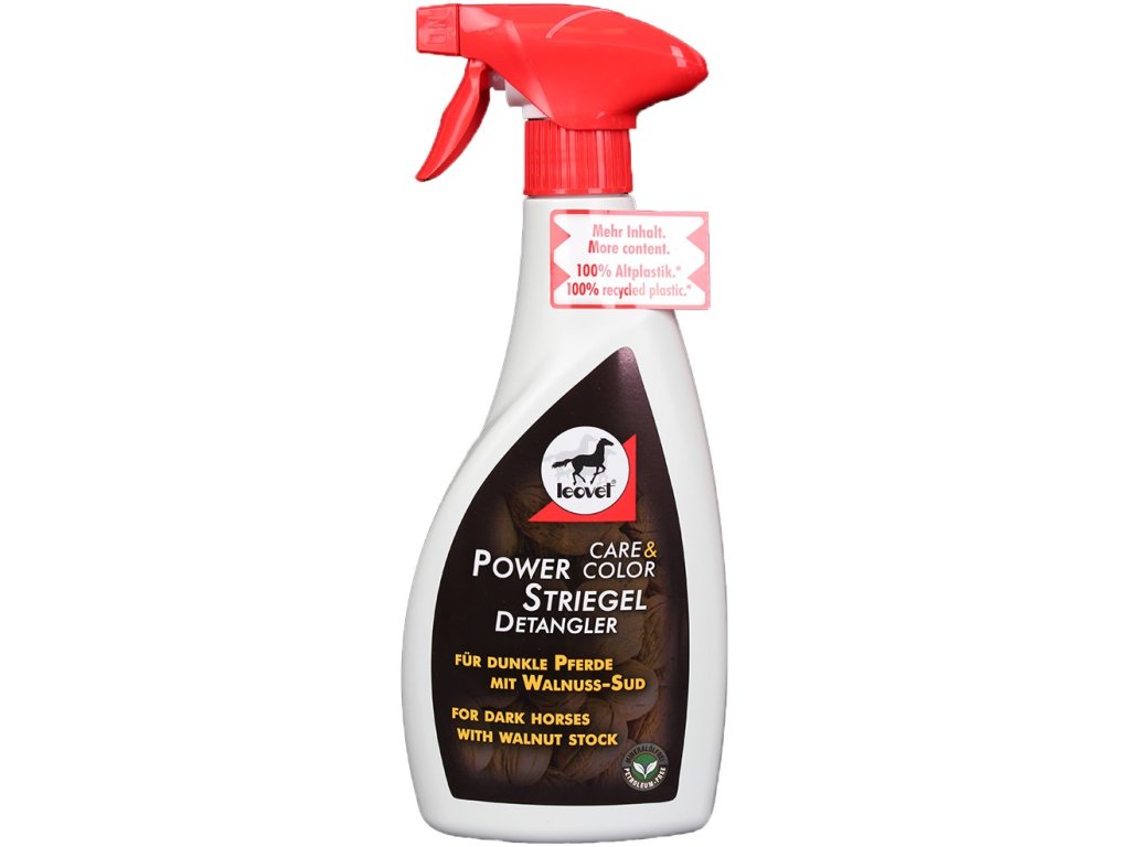 Leovet Power Striegel je špičkový přípravek speciálně zaměřený na tmavé koně. Díky přírodním pigmentům z výtažku vlašského ořechu výrazně zvýrazňuje tmavou barvu žíní a srsti a dodává jim hloubkový lesk. K tomu přidává ochranu proti UV záření, která zabraňuje blednutí barvy a chrání srst. Snadno se nanáší, nezanechává lepkavý film a zároveň odpuzuje prach. Výsledkem je hedvábná, lesklá a snadno rozčesatelná hříva a ocas. Složení obsahuje rovněž keratin a ricinový olej pro vyhlazení a výživu vlasu