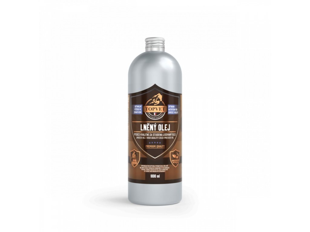 Lněný olej TOPVET 1000 ml Za studena lisovaný konopný doplněk pro koně – Omega 3 & 6 s vitaminem E
