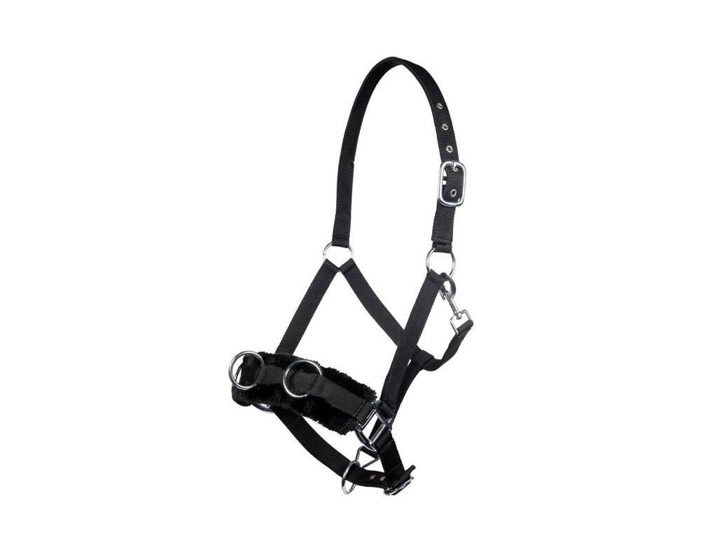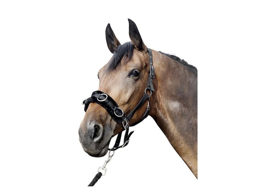 Lonžovací obnosek s měkým vypodložením, z umělého beránka. Stavitelná velikost, klasická karabina, stříbrné kování.