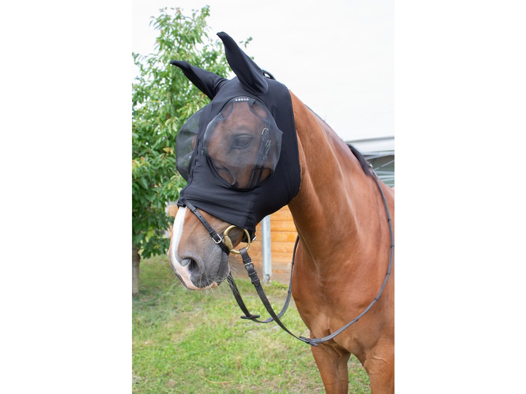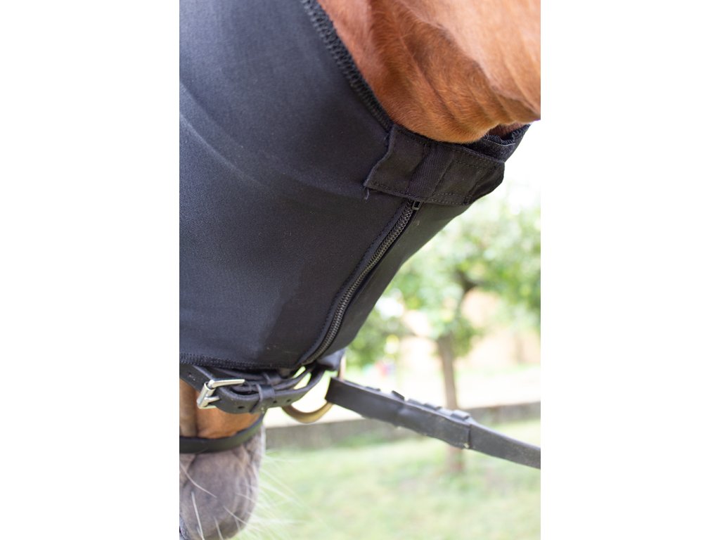 Jezdecká maska proti hmyzu se spodním zipem určená pro nasazení na uzdečku z příjemného elastického materiálu - lycry.