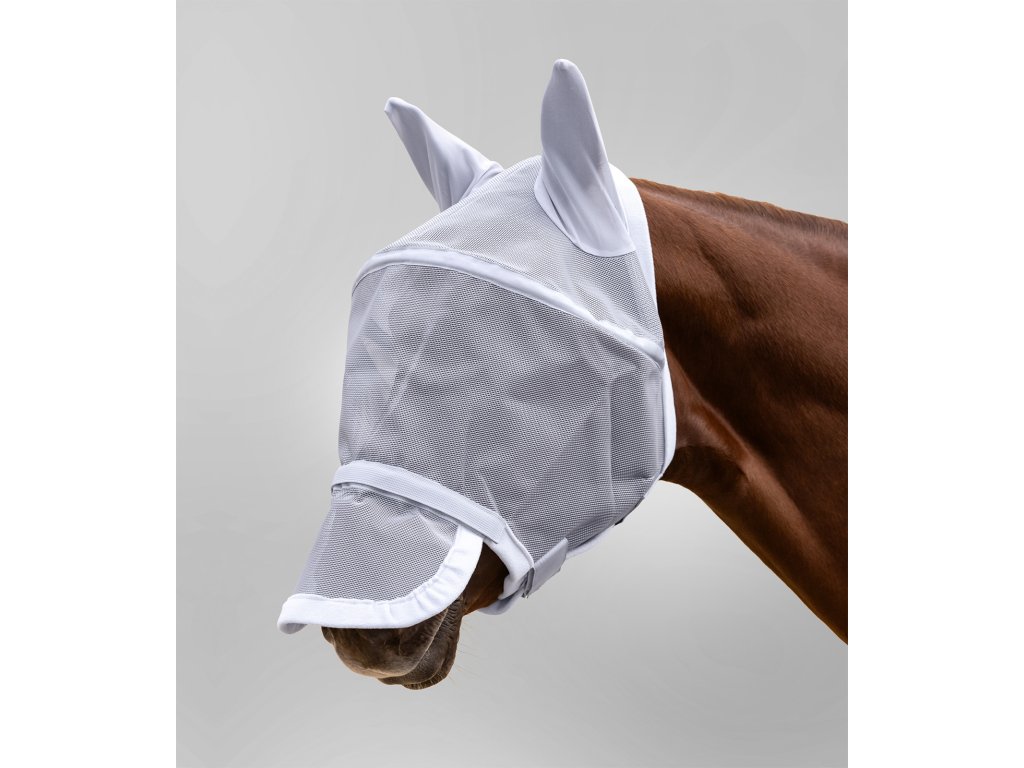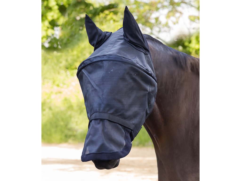Tato kruhová maska proti hmyzu PREMIUM je vybavena pevnou obručí, která zabraňuje kontaktu masky s koněm a zajišťuje dostatek prostoru v oblasti kolem očí. Díky obruči je maska pohodlná, netlačí a zamezuje kontaktu s očima koně. Součástí je také ochrana uší a nosní části - odnímatelná klapka na suchý zip, kterou je dle potřeby možné vyměnit za třásně, jež jsou součástí balení. z jemného, prodyšného materiálu, která chrání tyto citlivé oblasti před kousnutím a podrážděním. Materiál je lehký, odolný a dobře prodyšný. Maska je snadno nasaditelná a pevně drží na hlavě koně. Ideální pro ochranu v létě a při pobytu v oblastech s výskytem hmyzu.
