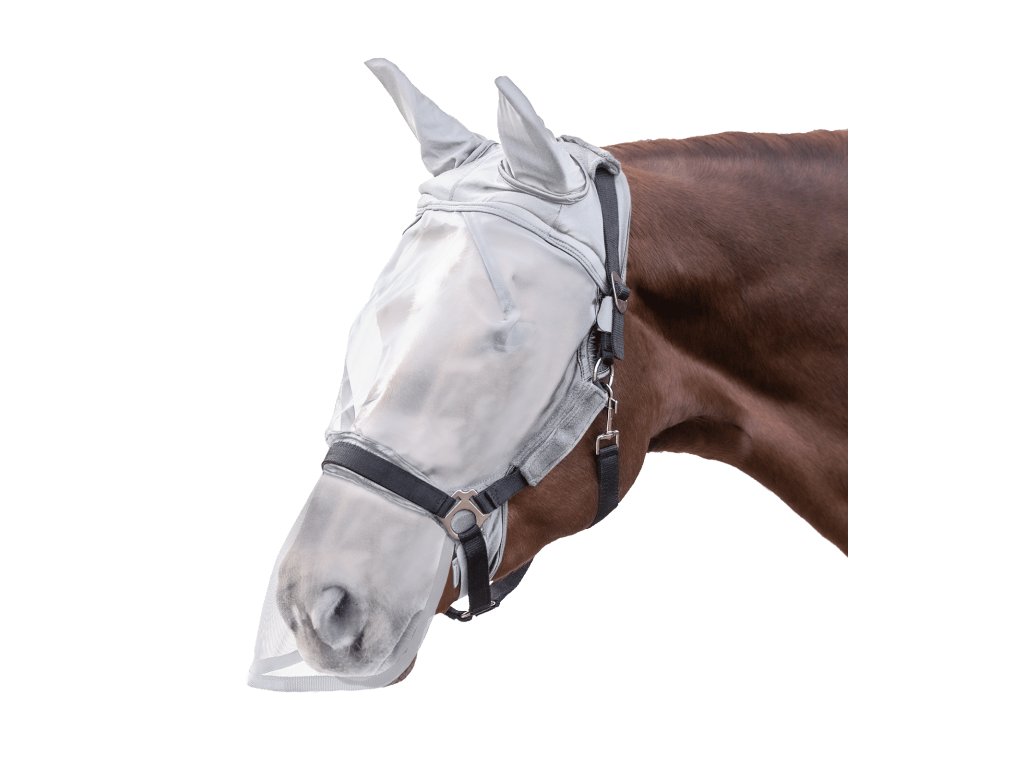 Maska PREMIUM je navržena pro maximální ochranu a komfort koně. Jemné polstrování v oblasti čela chrání proti odření, zatímco dostatek prostoru v oblasti očí zajišťuje pohodlí i pro citlivé jedince. Nosní pásek je elastický a lze jej individuálně nastavit. Praktické suché zipy na lícnicích a na nánosníku umožňují snadné a stabilní upevnění k ohlávce. Materiál poskytuje účinnou ochranu proti UV záření a zároveň neomezuje výhled koně.