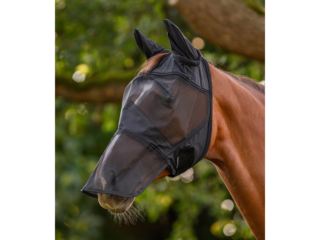 Maska proti hmyzu Premium je ideální pro ochranu koně před mouchami a bodavým hmyzem. Vyrobena z odolného síťového materiálu, který poskytuje dostatečnou ventilaci. Měkké fleecové polstrování v oblasti čela, uší a nosu zabraňuje odírání a zvyšuje komfort. Extra prostor kolem očí zaručuje pohodlné nošení bez tlaku na oko. Pro nos existují dvě možnosti – síťka nebo třásně – podle preference jezdce. Upevnění probíhá pomocí suchého zipu a maska dobře drží tvar díky výztuži u očí.