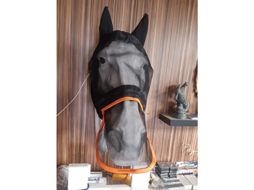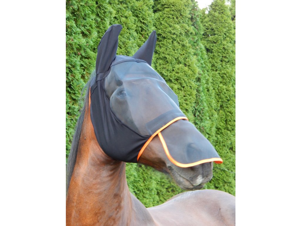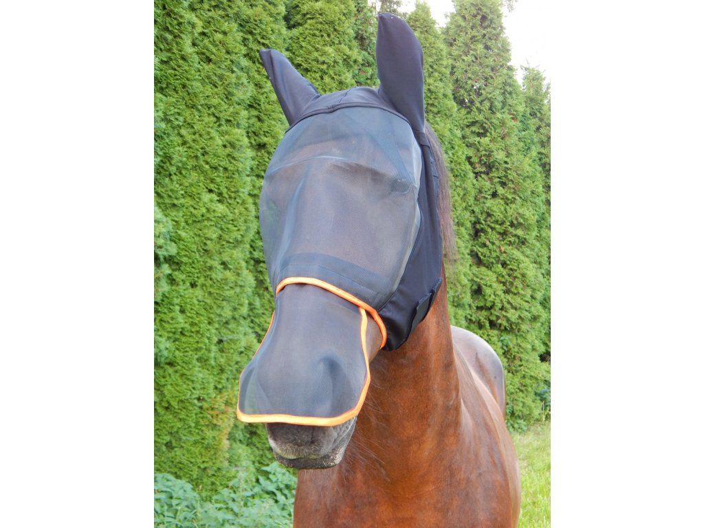 Tato ochranná maska poskytuje komplexní krytí hlavy koně proti obtěžujícímu hmyzu a zároveň snižuje vliv slunečního záření. Pružné uši se přizpůsobují tvaru hlavy a minimalizují riziko odřenin. Odnímatelný nosní díl umožňuje upravit míru ochrany podle aktuálních podmínek. Maska je vybavena dvěma suchými zipy a elastickým lemováním kolem hlavy, které zajišťuje bezpečné a pohodlné uchycení. Dostupná ve velikostech COB a FULL v černé barvě s oranžovým lemem.