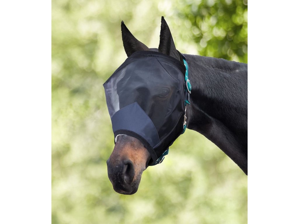 Maska se navléká přes hlavu bez nutnosti zapínání, ideální pro každodenní použití na pastvině nebo ve výběhu. Chrání oči a uši před hmyzem a je vhodná i pro citlivé koně. Lze prát v ruce nebo na šetrný program.