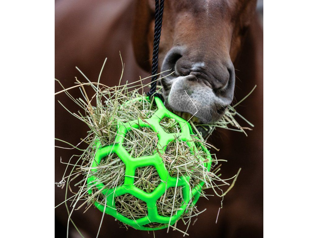 Míč na seno Waldhausen je skvělým pomocníkem pro zpomalení příjmu sena a udržení koně v psychické pohodě. Zajišťuje delší dobu krmení a zábavy, čímž působí preventivně proti nudě. Míč je snadno naplnitelný senem či pochoutkami, jako je mrkev nebo jablka, a pomocí 2 metrového popruhu jej lze zavěsit do boxu či výběhu. Vyroben z kvalitní termoplastické gumy, je pružný a odolný i při každodenním používání.