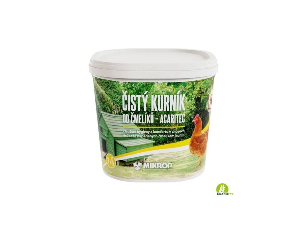 Acaritec je vysoce účinný přípravek proti čmelíkům v kurnících, slepičárnách a dalších chovech drůbeže. Efektivně působí také proti roztočům, klíšťatům, blechám, vším a dalšímu lezoucímu hmyzu, jako jsou mravenci, rybenky nebo škvory. Aplikace je možná rozprášením, postřikem nebo přímým posypem napadených míst. Účinkuje téměř okamžitě, přičemž si zachovává účinnost i po dešti. Aktivní složkou je amorfní oxid křemičitý – křemelina. Přípravek je vhodný pro preventivní i akutní použití. Balení 1 kg.