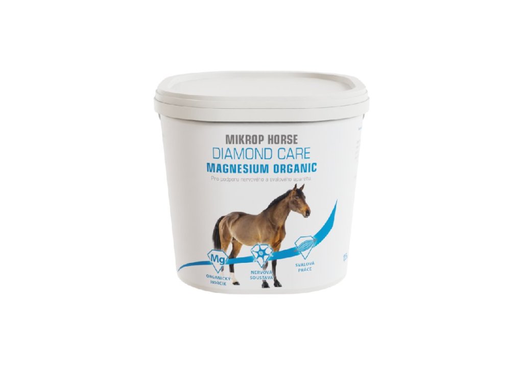 MIKROP® Horse Diamond Care Magnesium Organic je vysoce kvalitní organická forma hořčíku obohacená o vybrané minerály a vitamíny. Podporuje normální funkci nervové soustavy, přispívá ke klidnému chování při stresu, přepravě nebo před soutěžemi. Pomáhá předcházet svalovým křečím spojeným s intenzivní fyzickou aktivitou a zátěží. Díky výborné stravitelnosti je snadno přijímán i vybíravými jedinci. Produkt je vhodný pro sportovní, soutěžní, i pracovní koně.