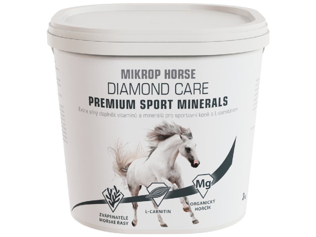 MIKROP® HORSE DIAMOND CARE PREMIUM SPORT MINERALS s L-karnitinem je prémiový vysoce koncentrovaný sypký vitamino-minerální přípravek s vysokým obsahem organicky vázaných látek, vitaminů, mikroprvků a esenciálních aminokyselin, receptura je přizpůsobena potřebám sportovních koní ve střední, vysoké a velmi vysoké zátěži. Doplněk je zcela bezobilný.