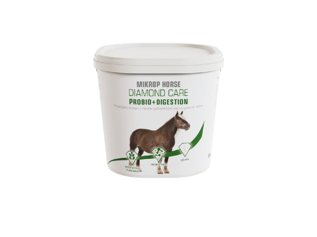 Kombinace probiotické vlákniny a ligninu pro podporu trávicích procesů MIKROP® HORSE DIAMOND CARE PROBIO+DIGESTION je doplňkové krmivo pro koně s obsahem živých mikroorganismů druhu Saccharomyces cerevisiae, prebiotické vlákniny, vitaminu E, K a vitaminů skupiny B. Doplňkové krmivo obsahuje živé kultury symbiotických mikroorganismů druhu Saccharomyces cerevisiae, rozpustnou vlákninu z jablečných výlisků a nerozpustnou vlákninu z vinných jader. Tyto složky dohromady napomáhají rozvoji žádoucích symbiotických mikroorganismů slepého a tlustého střeva při dysbalancích střevního mikrobiomu. V průběhu obnovy společenstva symbiotických mikroorganismů, např. po léčbě antibiotiky nebo po prodělaném zánětu střeva či při průjmech, může docházet ke snížené produkci vitamínů skupiny B a vitaminu K střevními bakteriemi. Tyto vitamíny jsou zahrnuty v receptuře pro dočasné pokrytí potřeby koňským metabolismem. Produkt je vhodné použít např. po léčbě antibiotiky, při přechodu na nový druh krmiva nebo při potížích s trávením.