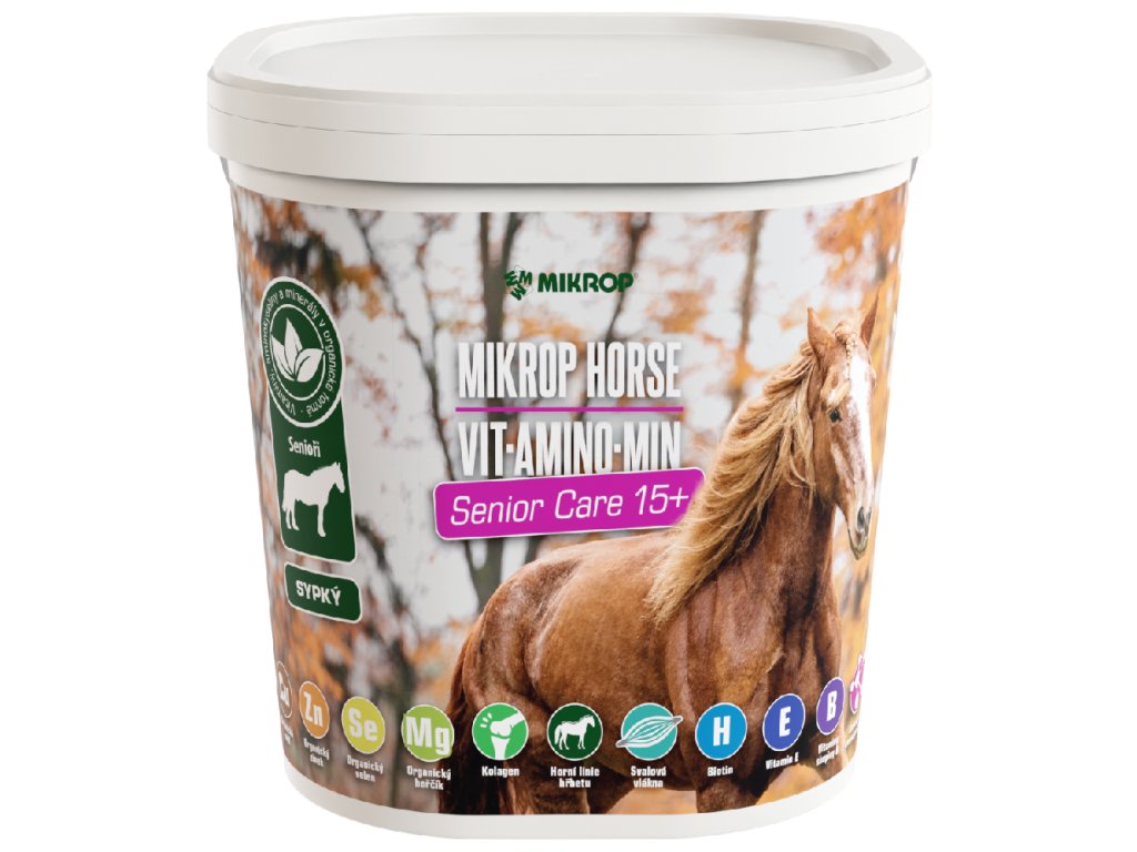 MIKROP® HORSE VIT.AMINO.MIN SENIOR CARE je prémiový sypký vitamino-minerální přípravek s vysokým obsahem organicky vázaných látek, vitaminů, mikroprvků a esenciálních aminokyselin, receptura je přizpůsobena potřebám koňských seniorů. Doplněk je bezobilný, s nízkým obsahem škrobů a cukrů.