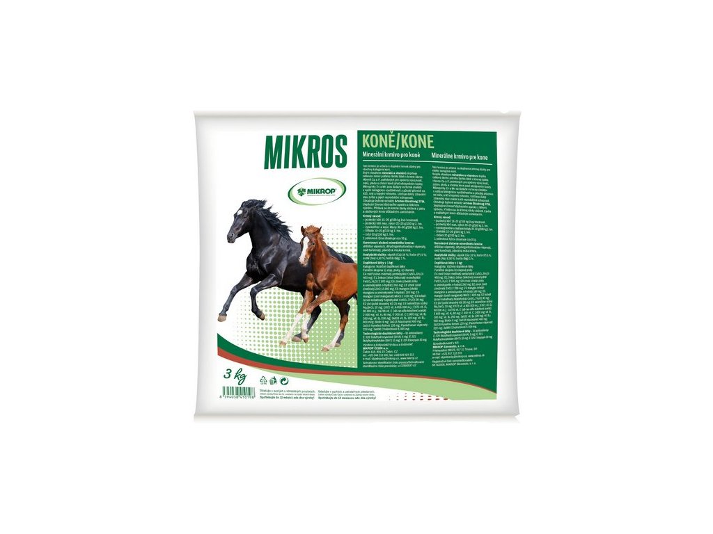Mikrop Mikros Koně je vyvinutý tak, aby vyrovnal minerální a vitamínové deficity ve výživě koní. Obsahuje vysoce využitelné bioplexy zinku a manganu, které podporují zdraví kůže, srsti a kopytních rohovin. Přítomnost vápníku a fosforu přispívá k dobrému vývoji kostry a zubů a chrání před odvápněním. Doplněno bylinnými extrakty Aromex Biostrong 375K pro podporu dýchání a metabolizmu. Přípravek zároveň zvyšuje celkovou kondici, reprodukční schopnosti a zlepšuje příjem a využití krmné dávky.