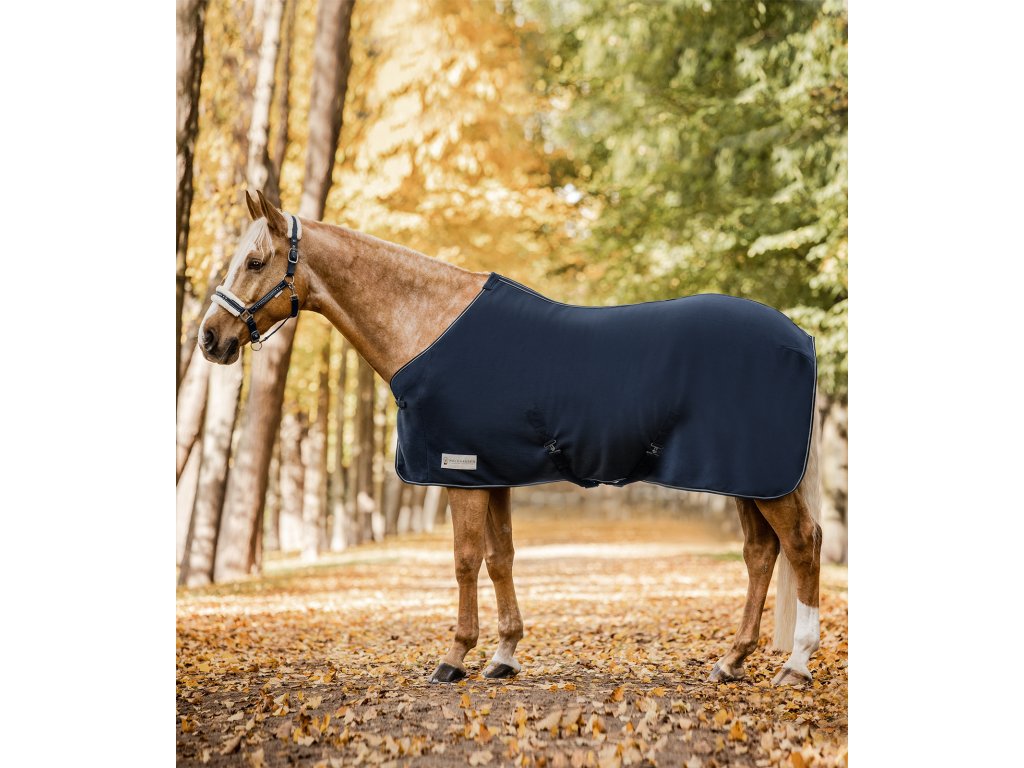Odpocovací deka Economic značky Waldhausen je praktickým pomocníkem po tréninku nebo při přepravě. Vyrobena ze 100% polyesteru, který efektivně odvádí vlhkost a pomáhá koni regenerovat po výkonu. Deka má jednoduché přední zapínání, křížové popruhy a ocasní šňůru pro stabilní uchycení. Měkké vypodložení v kohoutku chrání citlivé místo před odřením. Varianta v půlnoční modré barvě působí elegantně a profesionálně.