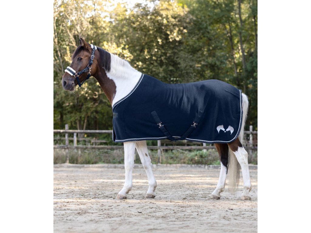 Fleesová deka Lucky od značky Waldhausen je ideální pro použití po tréninku. Je vyrobena z měkkého a funkčního materiálu, který odvádí pot a podporuje rychlé oschnutí koně. Přední T zapínání je kryté klopou na suchý zip, což zvyšuje pohodlí i bezpečnost. Křížové popruhy a ocasní šňůra zajišťují stabilní uchycení. Výrazná výšivka loga a decentní kontrastní lem ladí s produkty z kolekce Lucky.